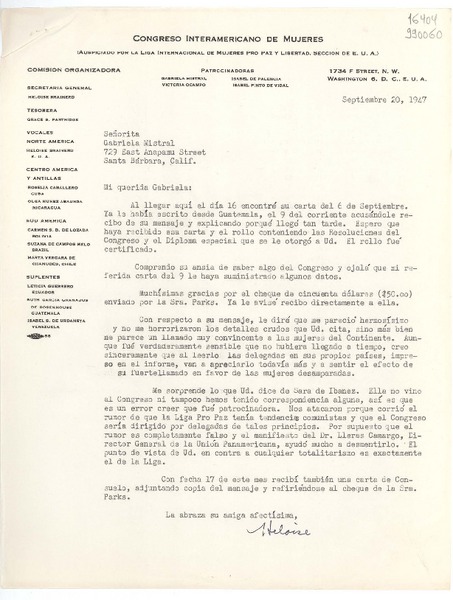 [Carta] 1947 sept. 20, Washington D. C., [Estados Unidos] [a] Señorita Gabriela Mistral, 729 East Anapamu Street, Santa Bárbara, Calif. [manuscrito] Heloise Brainerd.