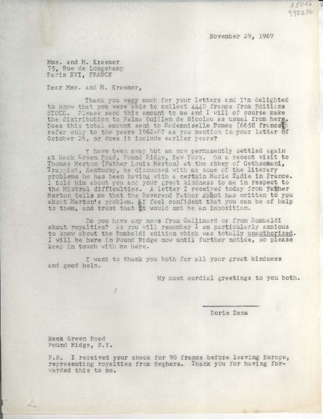 [Carta] 1967 juin 12, 118, Rue de Vaugirard, Paris VI°, [France] [a] Maître Marcelle Kraemer-Bach, Avocat à la Cour, [Paris], [France] [manuscrito] Pierre Seghers.