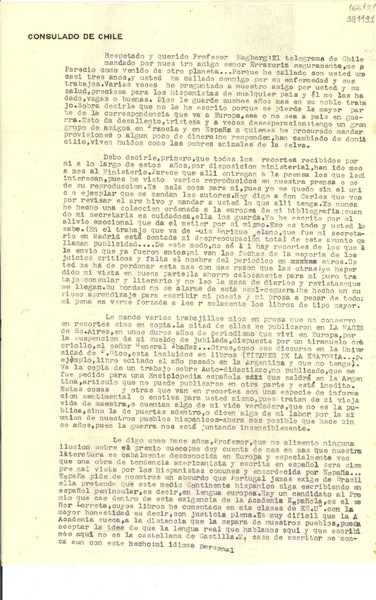 [Carta] 1943 dic. 27, Rio de Janeiro, [Brasil] [al] Exmo. Sr. Profesor Karl August Hagberg, Instituto Nobel, Estocolmo, Suecia [manuscrito] Palma Guillén.