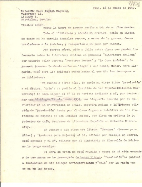 [Carta] 1940 ene. 18, Niza, [Francia] [al] Redaktör Karl August Hagberg, Tulevägen 11, Lidingö 1, Stockolmo, Suecia [manuscrito] Lucila Godoy (Gabriela Mistral), Cónsul de Chile en Niza.