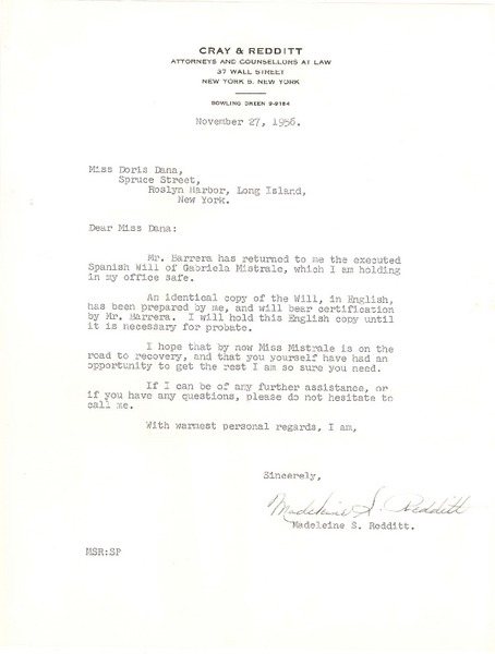[Carta] 1956 nov. 27, New York [a] Doris Dana, Long Island, New York [manuscrito] Madeleine S. Redditt.