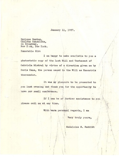 [Carta] 1957 jan. 11, [New York] [a] Enrique Bustos, New York [manuscrito] Madeleine S. Redditt.