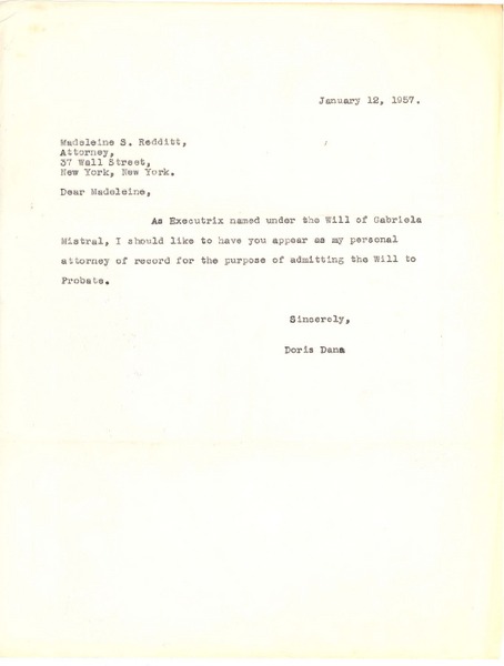 [Carta] 1957 jan. 12, [New York] [a] Madeleine S. Redditt, New York [manuscrito] Doris Dana.
