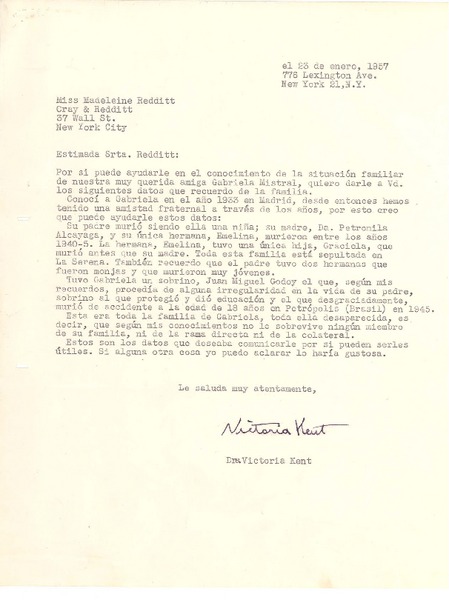 [Carta] 1957 ene. 23, New York [a] Madeleine S. Redditt, New York [manuscrito] Victoria Kent.