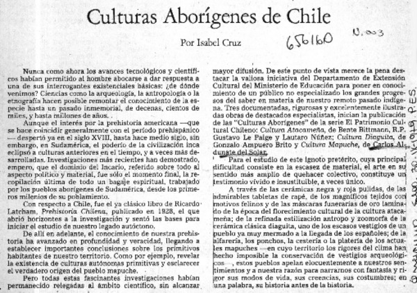 Culturas aborígenes de Chile [artículo] Isabel Cruz.