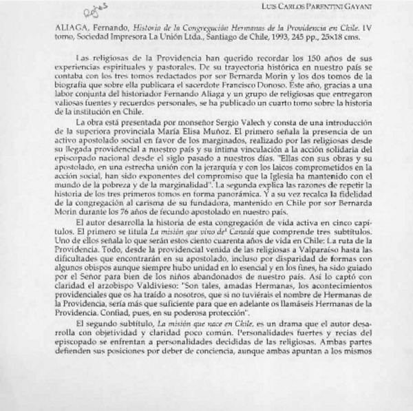 ALIAGA ROJAS, FERNANDO - HISTORIA DE LA CONGREGACION HERMANAS DE LA PROVIDENCIA EN CHILE
