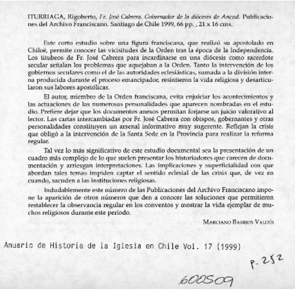 Autores chilenos - Iturriaga Carrasco, Rigoberto - José Cabrera, gobernador de la diócesis de Ancud