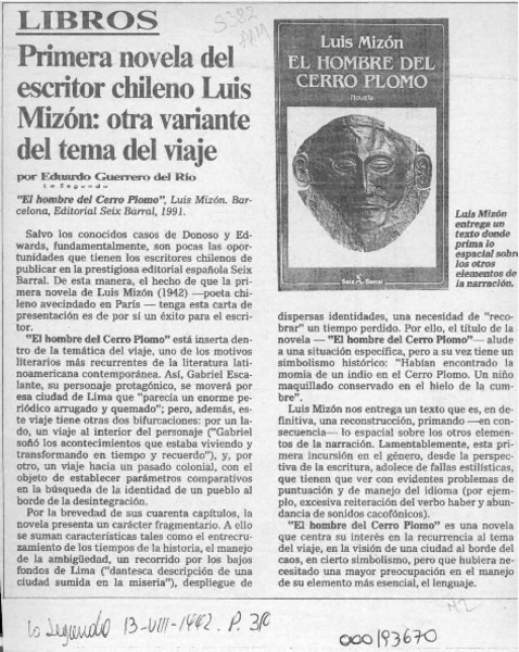 Primera novela del escritor chileno Luis Mizón, otra variante del tema del viaje [artículo] Eduardo Guerrero del Río.