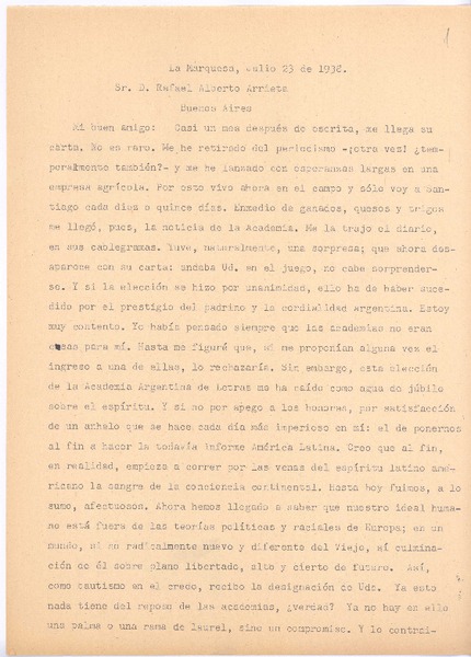 [Carta] 1938 jul. 23, San Antonio, Chile [a] Rafael Alberto Arrieta [manuscrito] Eduardo Barrios [transcripción].