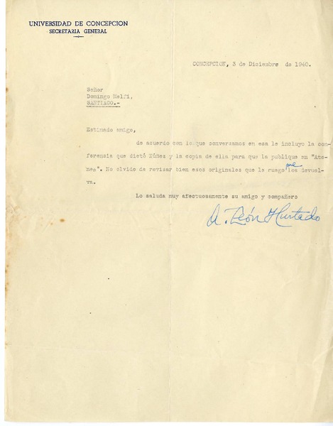 [Carta] 1940 diciembre 3, Concepción, Chile [a] Domingo Melfi [manuscrito] Avelino León Hurtado.