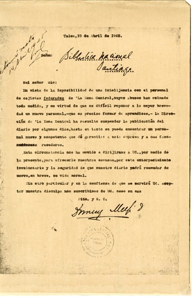 [Carta] 1925 abril 10, Talca, Chile [a] Biblioteca Nacional de Chile [manuscrito] Domingo Melfi.