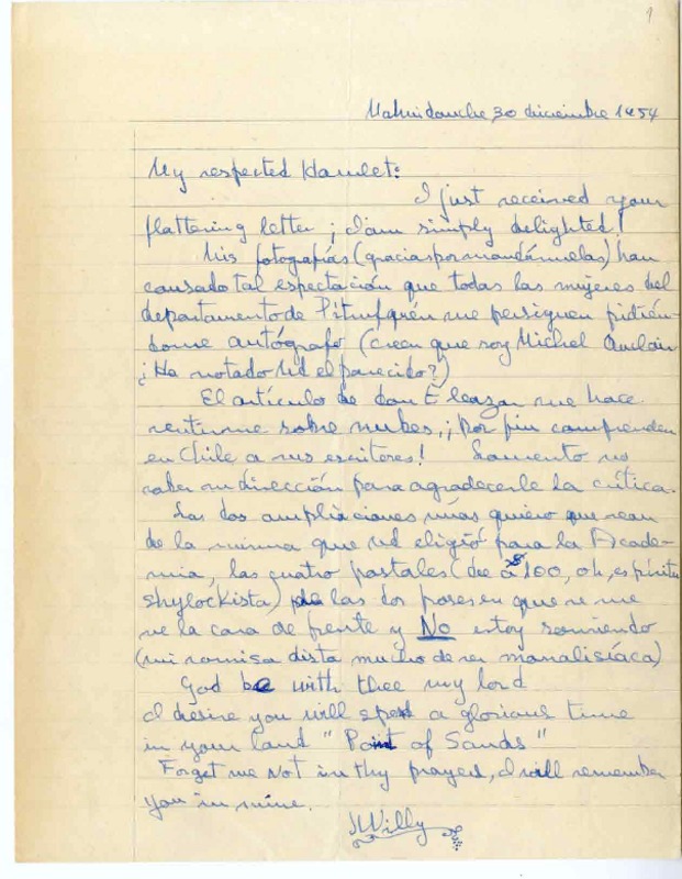 San Fernando, Chile [a] Diego Muñoz Carta, 1954 febrero 14, [manuscrito] José Pino Toro.