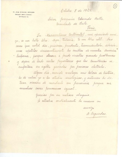 [Carta] 1926 oct. 8, Paris, Francia [a] Joaquín Edwards Bello [manuscrito] Alcides Arguedas.