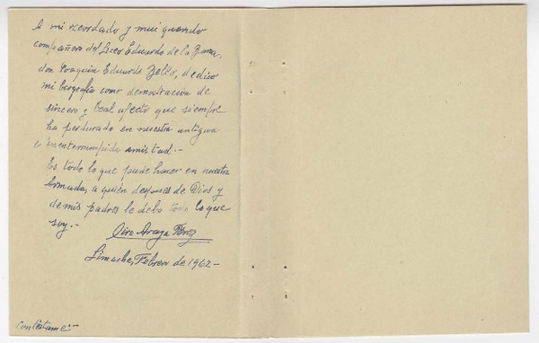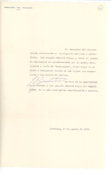[Carta] 1958 ago. 27, Santiago, Chile [a] Joaquín Edwards Bello [manuscrito] Fidel López Arteta.