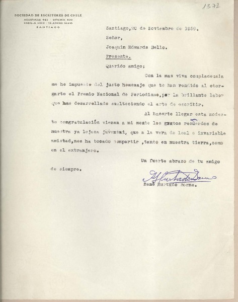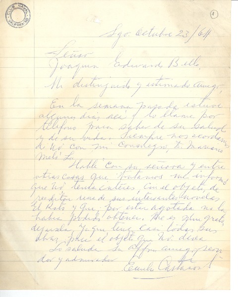 [Carta] [1954?], [Santiago, Chile] [a] Joaquín Edwards Bello [manuscrito] S.S.S