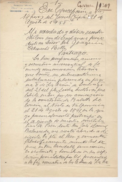 [Carta] 1958 agosto 21, Concepción, Chile [a] Joaquín Edwards Bello [manuscrito] Angel C. Mendoza Villa.