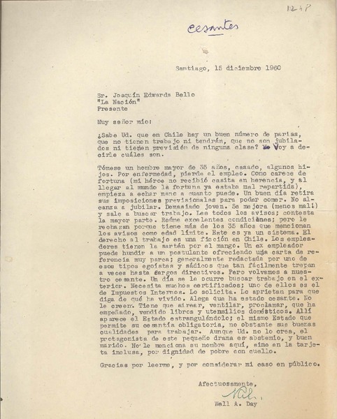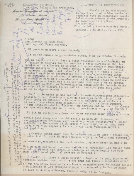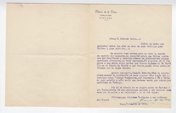 [Carta] 1953 diciembre, Santiago, Chile [a] Joaquín Edwards Bello [manuscrito] María de la Cruz.