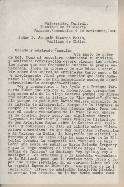 [Carta] 1946 septiembre 4, Caracas, Venezuela [a] Joaquín Edwards Bello [manuscrito] Mariano Picón Salas.
