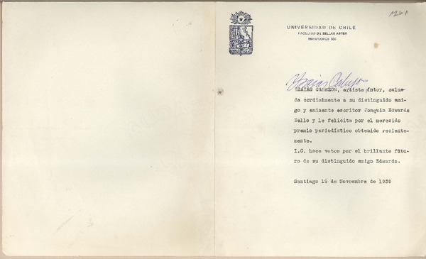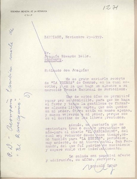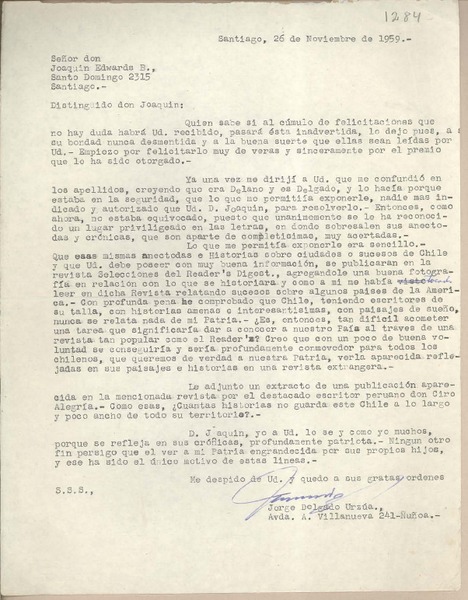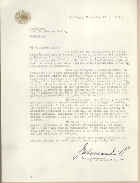 [Carta] 1959 nov. 21, Santiago, Chile [a] Joaquín Edwards Bello [manuscrito] Jorge Alessandri Rodríguez.
