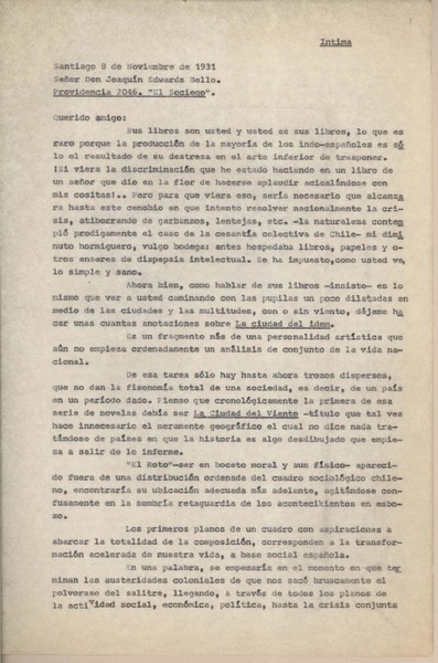 [Carta] 1931 noviembre 8, Santiago, Chile [a] Joaquín Edwards Bello [manuscrito] Camilo Mori ; transcripcion.