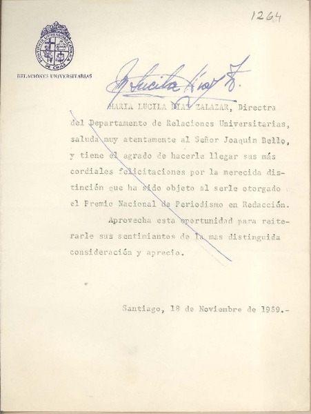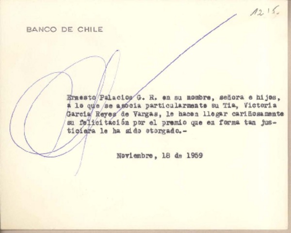 [Tarjeta] 1959 noviembre 18, Santiago, [Chile] [a] Joaquín Edwards Bello [manuscrito] María Lucila Díaz Zalazar.