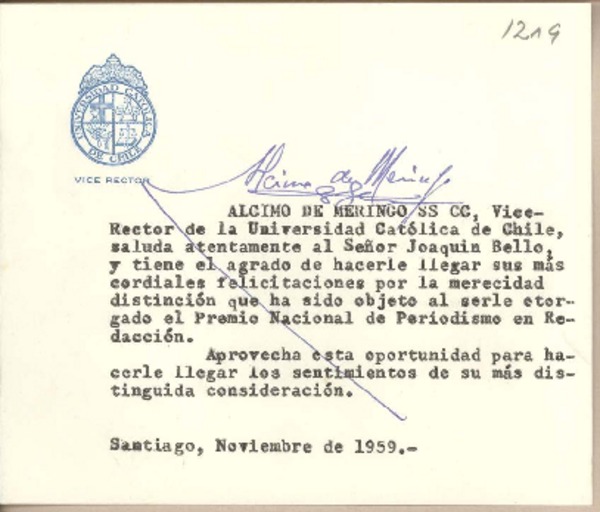 [Tarjeta] 1959 noviembre, Santiago, [Chile] [a] Joaquín Edwards Bello [manuscrito] Eugenio Pereira Salas.
