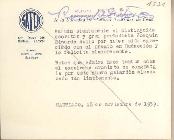 [Tarjeta] 1959 noviembre 18, Santiago, [Chile] [a] Joaquín Edwards Bello [manuscrito] Rogel Retes B.