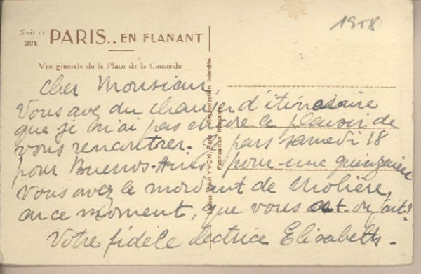 [Tarjeta postal] 1949, Paris, Francia [a] Joaquín Edwards Bello [manuscrito] Elizabeth.