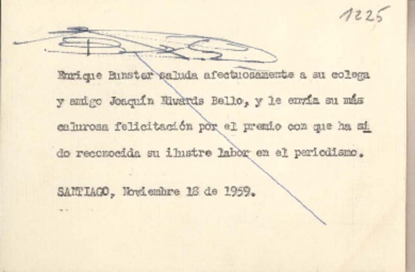 [Tarjeta] 1959, noviembre 18, Santiago, [Chile] [a] Joaquín Edwards Bello [manuscrito] Enrique Bunster.