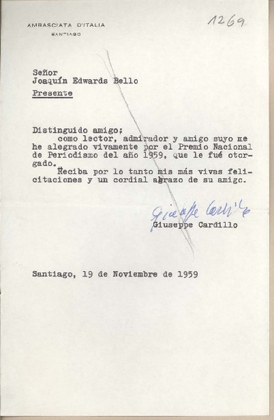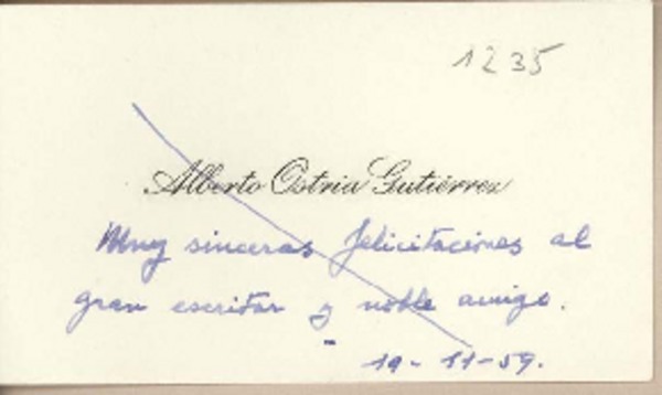[Tarjeta] 1959 noviembre 19, [Santiago, Chile] [a] Joaquín Edwards Bello [manuscrito] Alberto Ostria G.