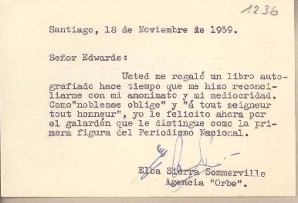 [Tarjeta] 1959 noviembre 18, Santiago, [Chile] [a] Joaquín Edwards Bello [manuscrito] Elba Sierra Sommerville.