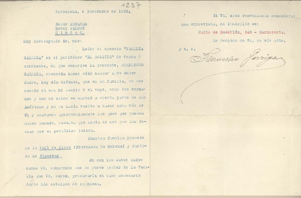 [Carta] 1925 noviembre 5, Barcelona, [España] [a] Joaquín Edwards Bello [manuscrito] Francisco Garriga.
