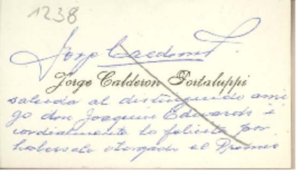 [Tarjeta] 1959 noviembre 20, Santiago, [Chile] [a] Joaquín Edwards Bello [manuscrito] Jorge Calderón Portaluppi.