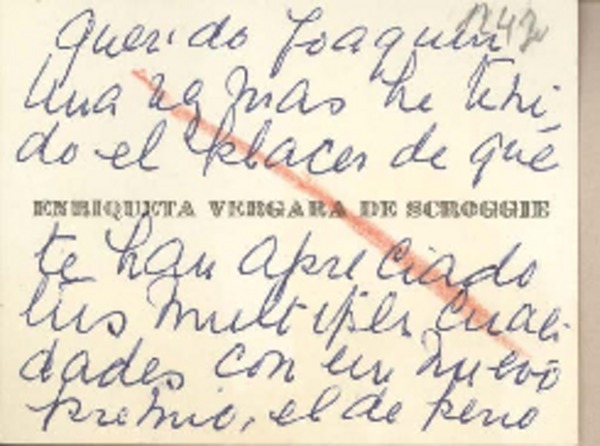 [Tarjeta] [1959], Santiago, [Chile] [a] Joaquín Edwards Bello [manuscrito] Enriqueta Vergara de Scroggie.
