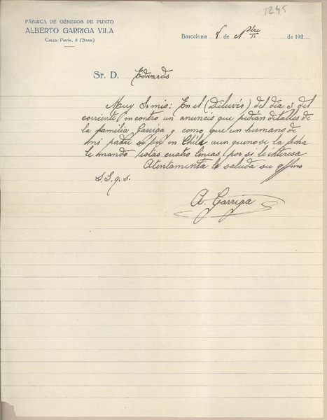 [Carta] 1925 noviembre 8, Barcelona, [España] [a] Joaquín Edwards Bello [manuscrito] Alberto Garriga.