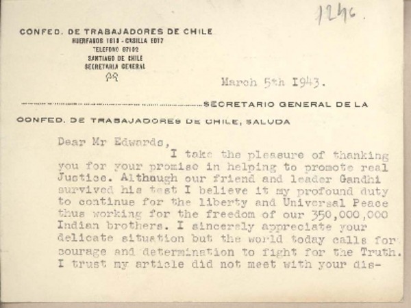 [Carta] 1943 marzo 5, Santiago, [Chile] [a] Joaquín Edwards Bello [manuscrito] Carl John Wilson.