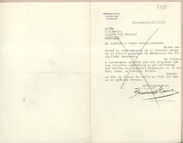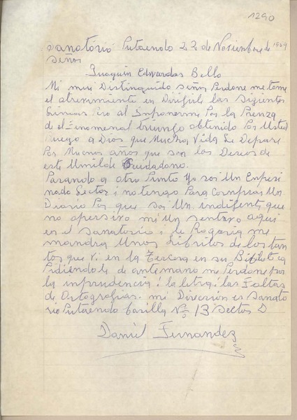 [Carta] 1959 noviembre 18, Santiago, [Chile] [a] Joaquín Edwards Bello [manuscrito] Fidel López Arteta.