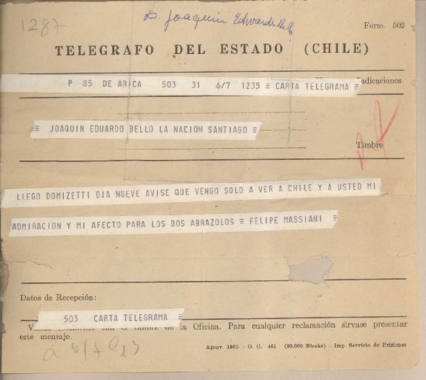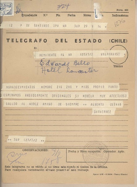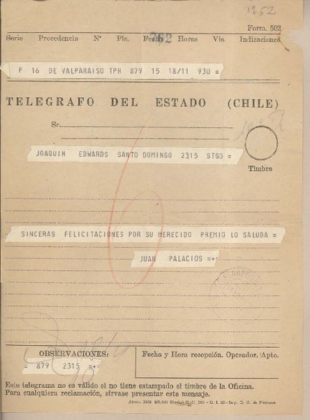 [Telegrama] 1959 noviembre 18, Valparaíso, [Chile] [a] Joaquín Edwards Bello [manuscrito] Juan Palacios.