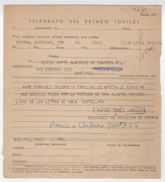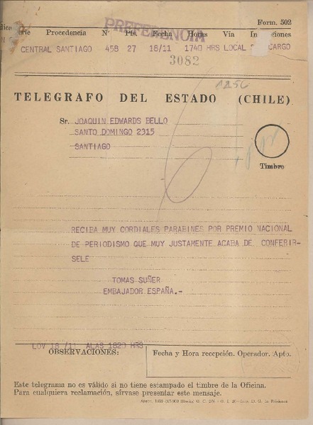 [Telegrama] 1959 noviembre 18, Santiago, [Chile] [a] Joaquín Edwards Bello [manuscrito] Tomás Suñer.