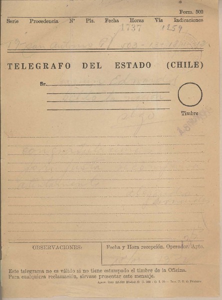 [Telegrama] 1959 noviembre 19, Temuco, [Chile] [a] Joaquín Edwards Bello [manuscrito] Alfredo Polanco.