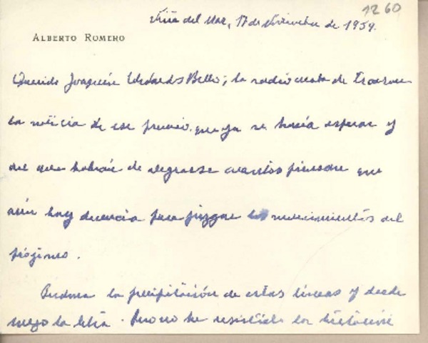 [Tarjeta] 1959 noviembre 17, Viña del Mar, [Chile] [a] Joaquín Edwards Bello [manuscrito] Alberto Romero.