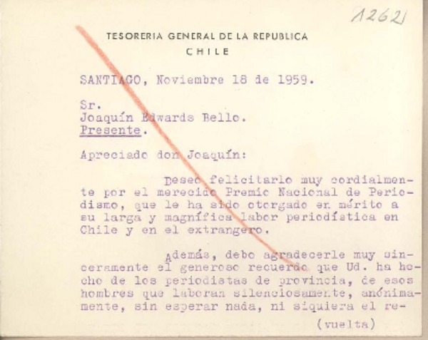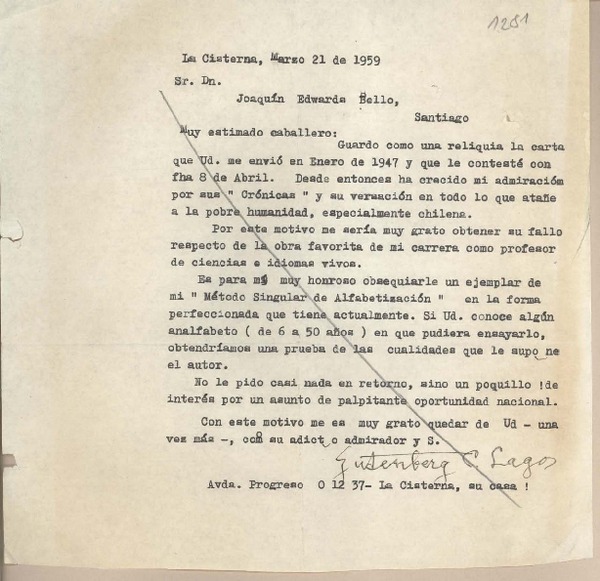 [Carta] 1959 marzo 21, Santiago, [Chile] [a] Joaquín Edwards Bello [manuscrito] Gutenberg C. Lagos.