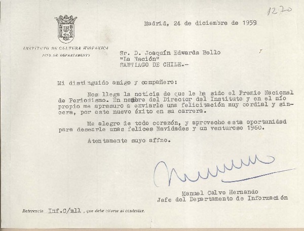 [Carta] 1959 diciembre 24, Madrid, [España] [a] Joaquín Edwards Bello, Santiago de Chile [manuscrito] Manuel Calvo Hernando.