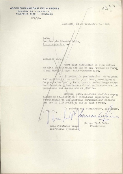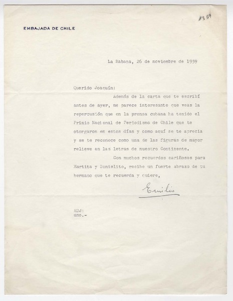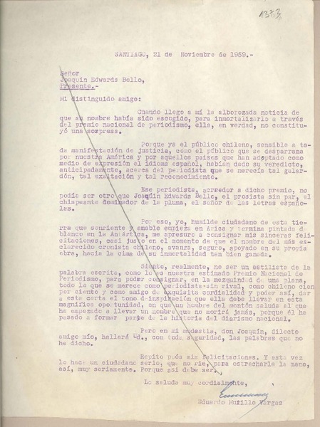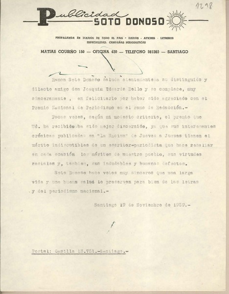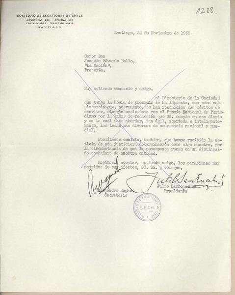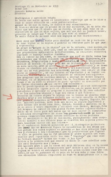 [Carta] 1959 noviembre 18, Santiago, [Chile] [a] Joaquín Edwards Bello [manuscrito] Diego Barros Ortíz.
