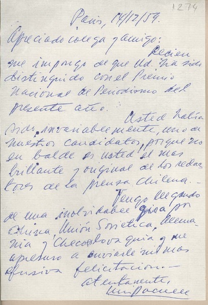 [Carta] 1959 diciembre 14, París, [Francia] [a] Joaquín Edwards Bello [manuscrito] Emilio Pacull.