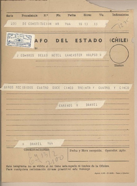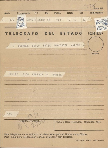 [Telegrama] 1961 febrero 12, Constitución, [Chile] [a] Joaquín Edwards Bello, [Valparaíso] [manuscrito] Daniel [Cádiz].