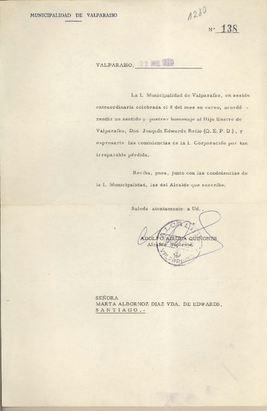 [Oficio N°138] 1968 marzo 22, Valparaíso, [Chile] [a] Marta Albornoz [manuscrito] Municipalidad de Valparaíso.