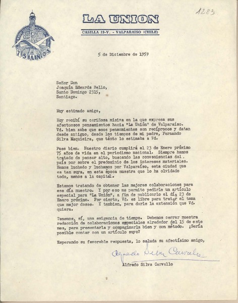 [Carta] 1959 diciembre 5, Valparaíso, [Chile] [a] Joaquín Edwards Bello [manuscrito] Alfredo Silva Carvallo.