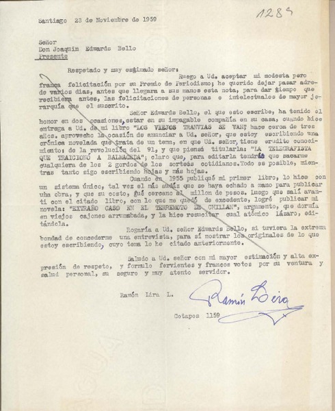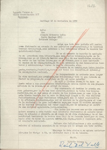 [Carta] 1959 noviembre 18, Santiago, [Chile] [a] Joaquín Edwards Bello [manuscrito] Ignacio Herane A. (Raúl del Valle).