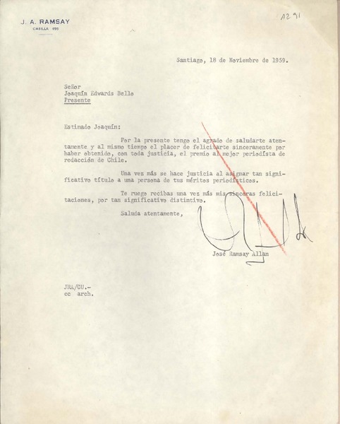 [Carta] 1959 noviembre 18, Santiago, [Chile] [a] Joaquín Edwards Bello [manuscrito] José Ramsay Allan.